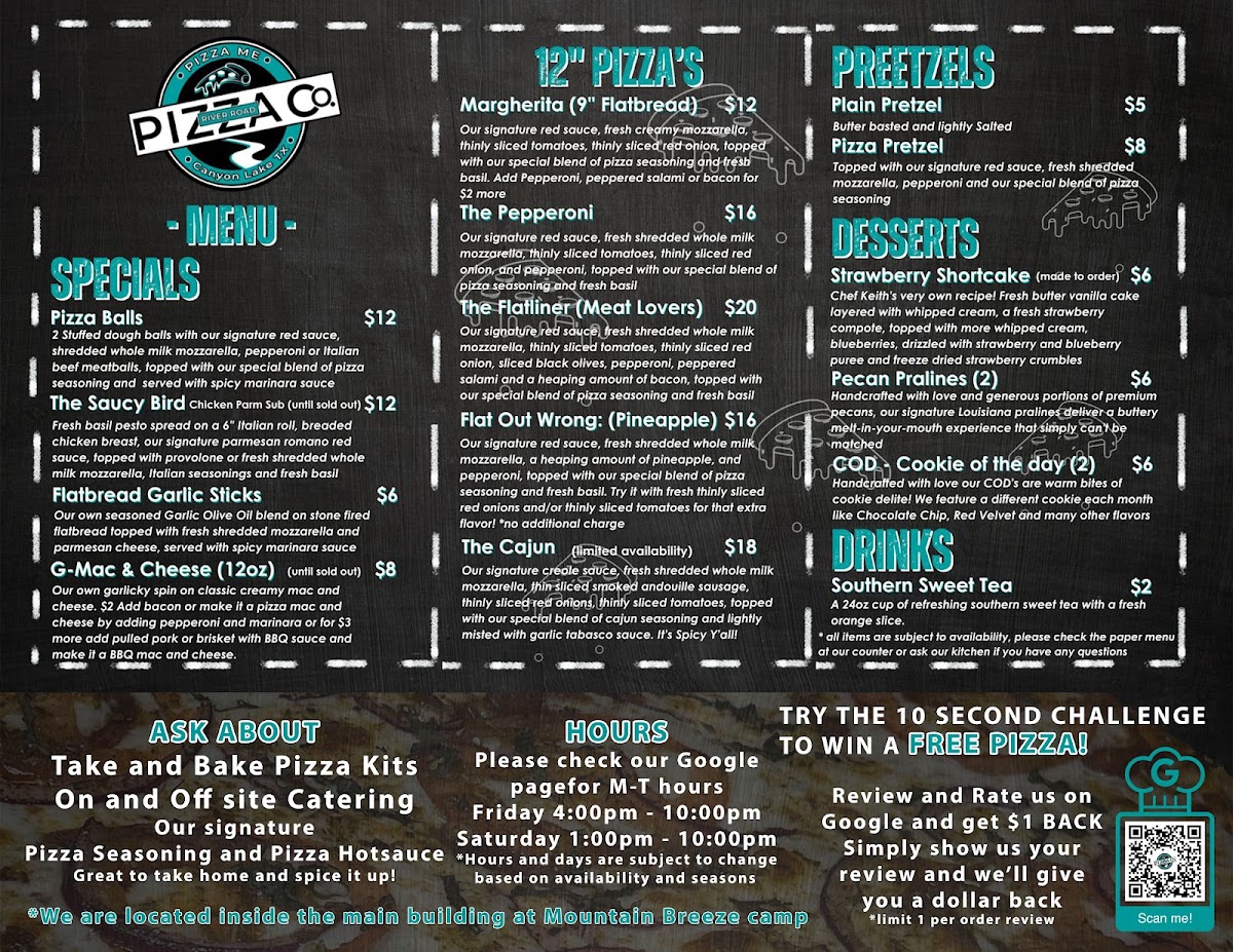 If you're looking for a laid-back spot to enjoy delicious pizza in New Braunfels, the River Road Pizza Co. Menu offers a mouthwatering selection that’s sure to hit the spot. Nestled in the scenic 201 Mt Breeze Camp area, this cozy spot is a favorite for locals and visitors alike. The menu features everything from classic pies with rich, melty cheese and crispy crust to more adventurous toppings that satisfy all kinds of cravings. Whether you're in the mood for something simple like a Margherita pizza or a bold, meaty creation, there’s something here for everyone. Don’t forget to pair your meal with one of their refreshing beverages, perfect for cooling down after a bite. From start to finish, the River Road Pizza Co. Menu invites you to indulge in pizza that’s as flavorful as it is satisfying.